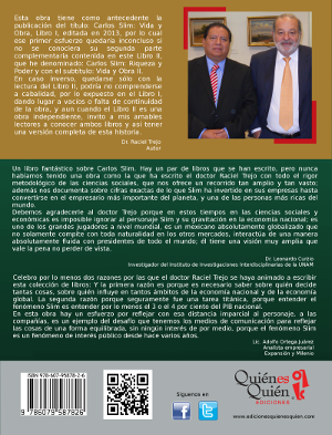 Un libro fantástico sobre Carlos Slim. Hay un par de libros que se han escrito, pero nunca habíamos tenido una obra como la que ha escrito el doctor Raciel Trejo con todo el rigor metodológico de las ciencias sociales, que nos ofrece un recorrido tan amplio y tan vasto; además nos documenta sobre cifras exactas de lo que Slim ha invertido en sus empresas hasta convertirse en el empresario más importante del planeta, y una de las personas más ricas del mundo.